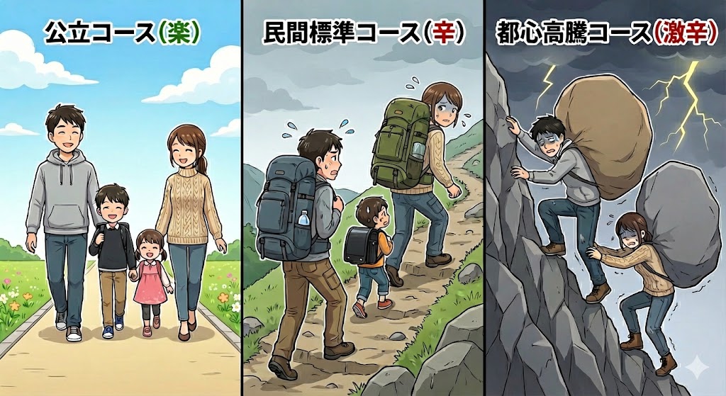 このコース分けにおいて恐ろしいのは、子供の学力や親の職業に関係なく、「どの自治体(区)に住んでいるか」という制度の壁だけで、自動的に決まってしまうという点です。