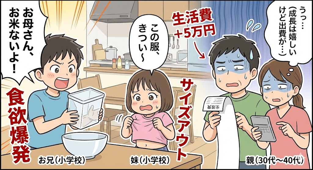 家庭にもよりますが、未就学児時代と比較して「約1.5倍(金額にして+3万円〜)」の食費増は見込んでおくべきです。