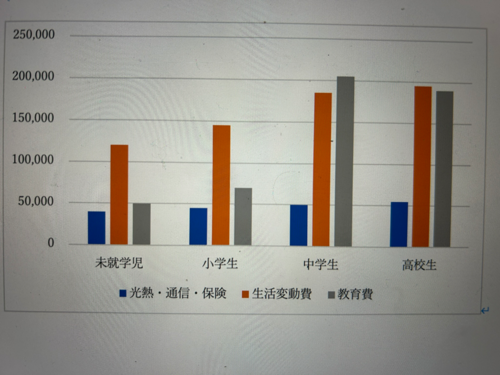 具体的な数字を見てみましょう。 一番左の「未就学児」と、真ん中の「中学生」を比較すると、平均して月額23万円ほど支出が増加しています。