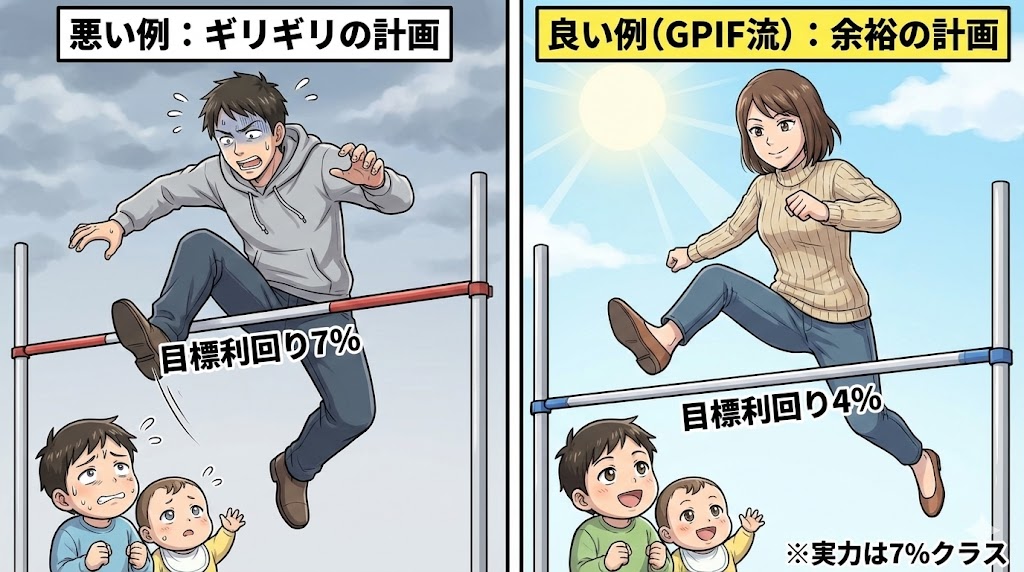 今回は、私たちの年金を運用するプロ中のプロ「GPIF(年金積立金管理運用独立行政法人)」のロジックを元に、なぜ彼らが**「期待リターン7%超」の商品を買いながら、「目標リターン4%」で計画を立てているのか**。