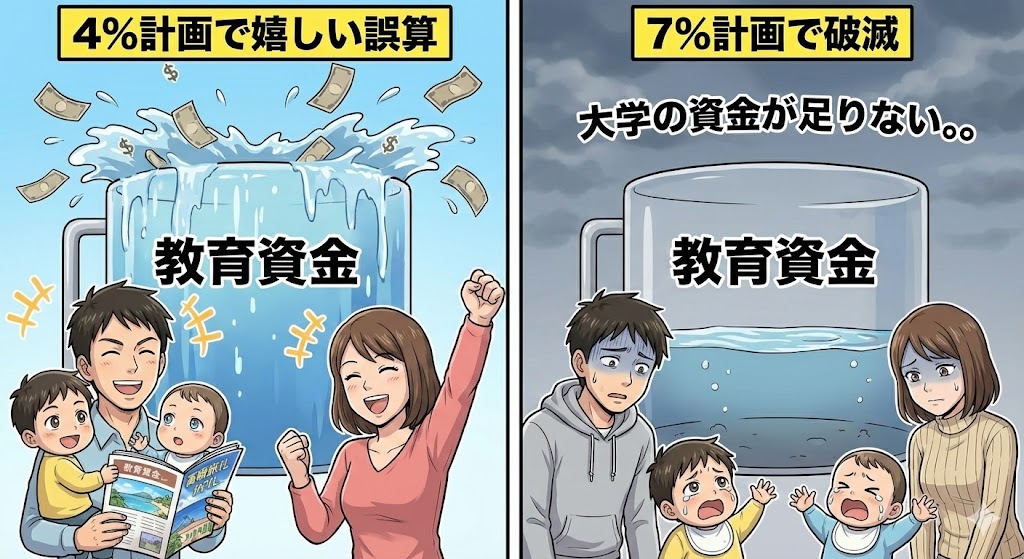 逆に、7%で計画して4%しか出なかったら? それは**「破滅(Ruins)」**です。子供に奨学金という借金を背負わせることになります。