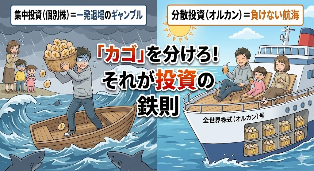 なお、S&P500(米国株)への集中投資も悪くはありませんが、理論上は米国がコケるリスクを抱えています。 一方、全世界株式(オルカン)は、地球上のすべての優良企業に分散することで、この無駄なリスクを極限まで排除しています。こちらについては、以下の記事で詳しく解説をしております。