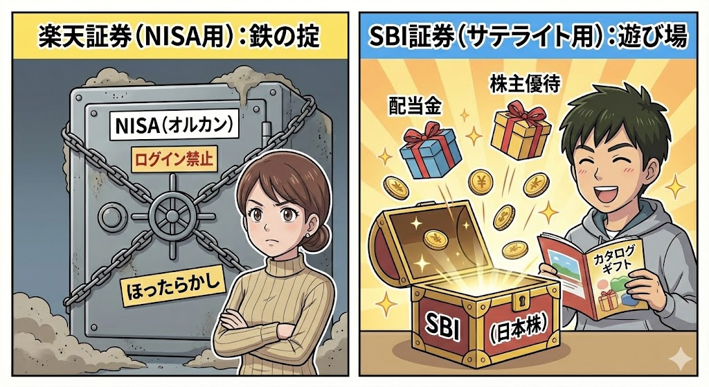 - 楽天証券(NISA専用):オルカンを淡々と積み立てる口座。「開かずの金庫」として、普段は一切ログインしない。