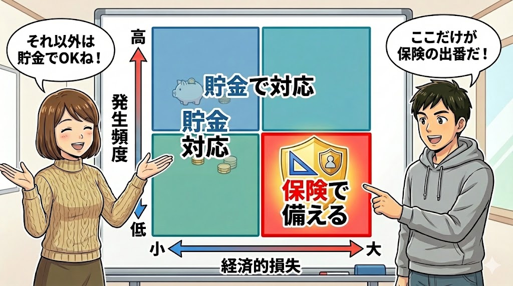 - 【B】発生確率「低」× 損害額「大」(死亡、火事、億単位の賠償) → 「保険」で備える(ここだけ!)