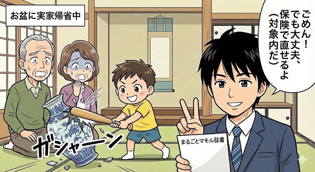 お盆に帰省中、おじいちゃんがソファに置いていた眼鏡(5万円)を、子供がジャンプして踏み潰した。 → 【全額補償】 多くの保険は同居の家族や親族への賠償は免責(出ない)ですが、これは別居の父母(祖父母)も対象になり得ます。ここが最強たる所以です。