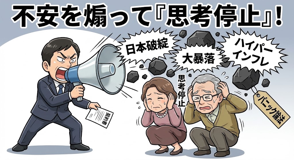 1. 極端な未来図で不安を煽る 「日本国債の暴落」「ハイパーインフレ」「預金封鎖」。 普段ならまさかと笑い飛ばせる極論も、権威ある支店長に「プロの視点ですが…」と真顔で囁かれると、リアリティを持って迫ってきます。